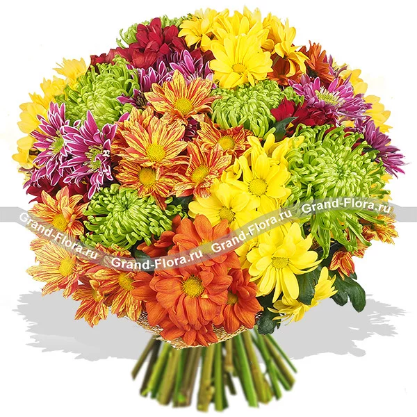 Кто сказал, что хризантема – это довольно простой и весьма заурядный цветок? Если вы посмотрите на букет из хризантем «Осенний блюз», то поймете, почему этот цветок у японцев является культовым. Хризантема - это маленькое солнышко, а букет хризантем – настоящий залитый солнцем небосклон.