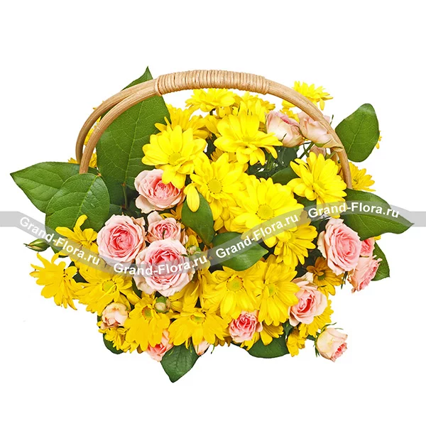 Уменьшенный: хризантема кустовая ромашковая - 5 шт., роза кустовая розовая - 1 шт., салал, оазис, корзина.