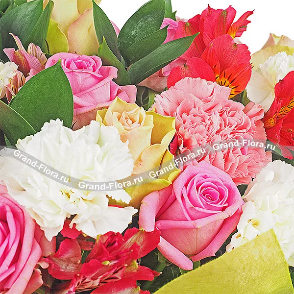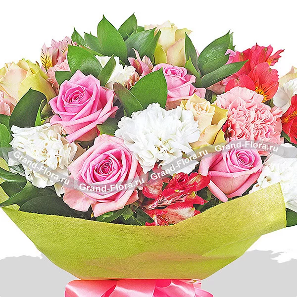 Стандартный (на фото): роза розовая - 5 шт., роза желтая - 4 шт., гвоздика розовая - 5 шт., гвоздика белая - 5 шт., альстромерия розовая - 1 шт., альстромерия красная - 2 шт.,