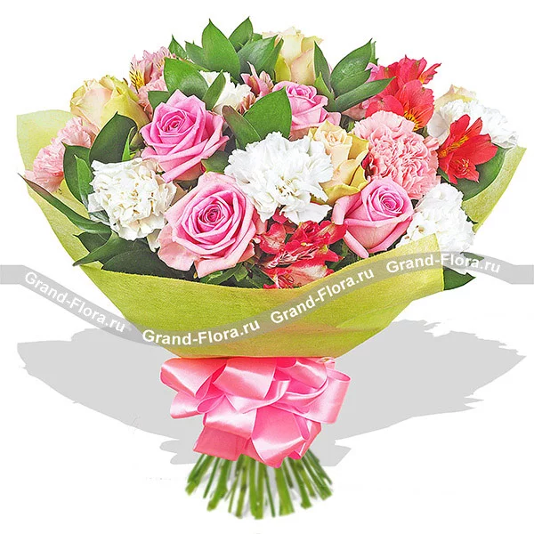 Уменьшенный: роза розовая - 3 шт., роза желтая - 2 шт., гвоздика розовая - 3 шт., гвоздика белая - 3 шт., альстромерия розовая - 1 шт., альстромерия красная - 1 шт., рускус, фетр зеленый, бант розовый.