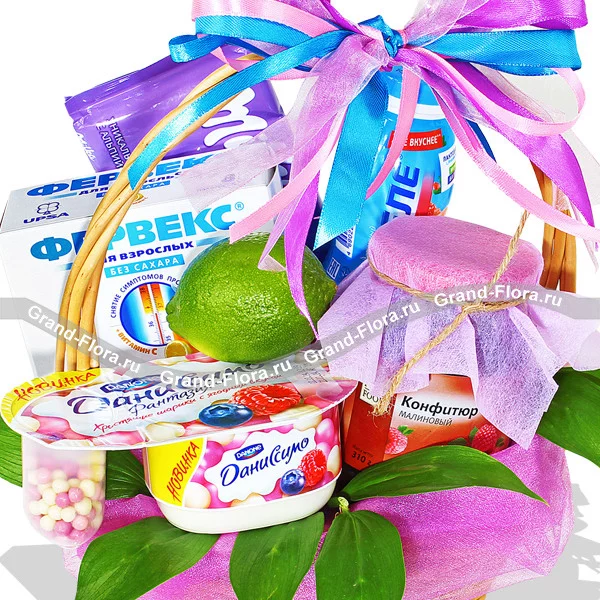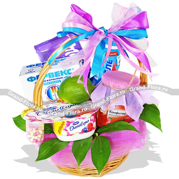 Стандартный: лайм - 1 шт., шоколад "Milka" - 1 шт., даниссимо - 1 шт.,  конфитюр - 1шт., Фервекс - 1 уп., корзина средняя, декор.