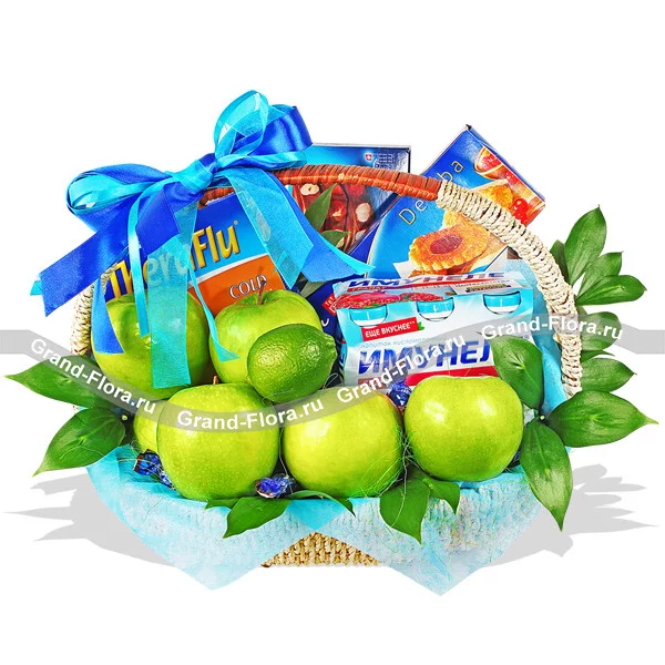 Стандартный: яблоки - 1 кг, лайм - 1 шт, имунеле - 6 шт, печенье с джемом - 1 уп, молочный шоколад с цельным орехом - 1 шт, ТераФлю - 1 уп, корзина средняя, декор.