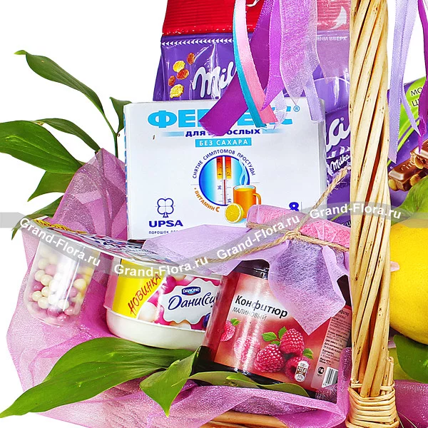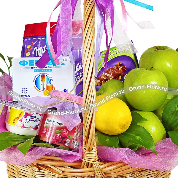Уменьшеный: яблоки - 0,5 кг, лимон - 1 шт, шоколад "Milka" - 1 шт, даниссимо - 1 шт, конфитюр - 1 шт, Фервекс - 1уп., корзина малая, декор.