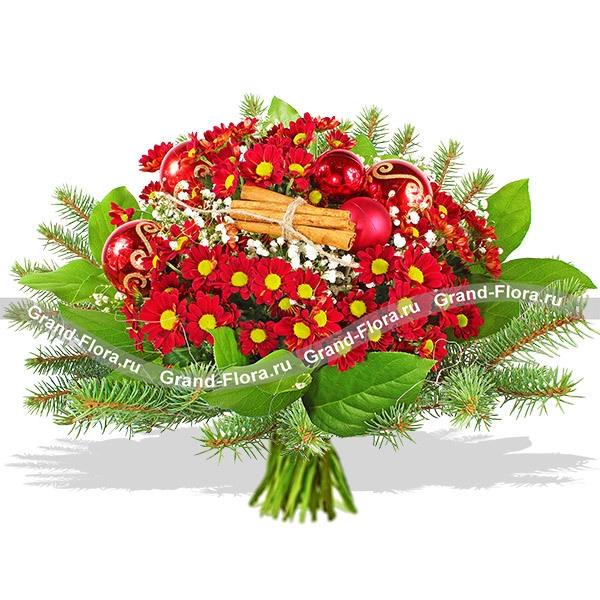Уменьшенный: хризантема красная ромашковидная - 3шт., гипсофила - 3шт., еловая ветвь, корица, новогодний декор и зелень, сетка.