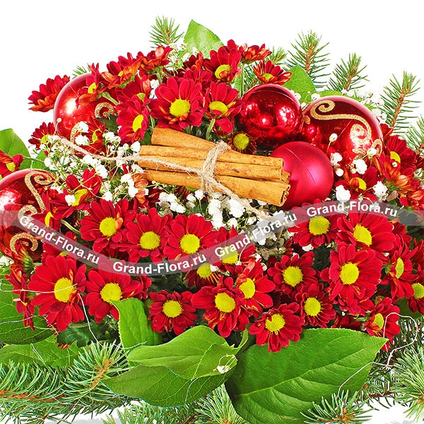 Стандартный (на фото): хризантема красная ромашковидная - 5шт., гипсофила - 4шт., еловая ветвь, корица, новогодний декор и зелень, сетка.