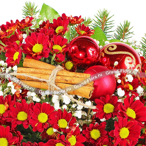 ЛЮКС: хризантема красная ромашковидная - 7шт., гипсофила - 7шт., еловая ветвь, корица, новогодний декор и зелень, сетка.