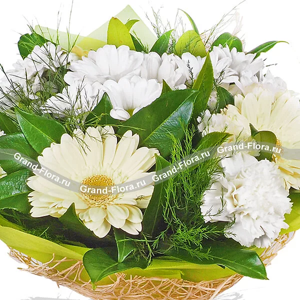 Стандартный: гербера кремовая - 5 шт., гвоздика белая - 4 шт., хризантема кустовая белая - 2 шт., декоративная зелень, фетр зеленый, ротанг бежевый, бант кремовый.