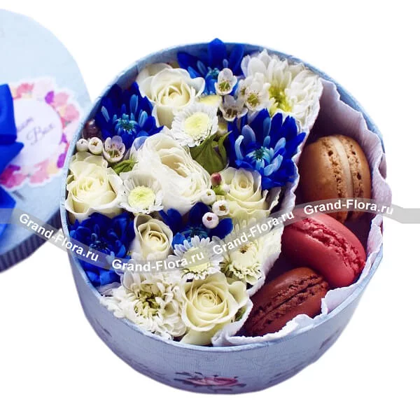 Стандартный (на фото): роза белая - 5 шт., хризантема синяя - 1 шт., хризантема белая - 1 шт., оазис, белый фетр, мини коробка (14х14см), макарунс - 3 шт.