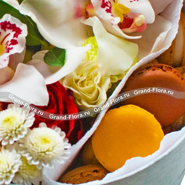 Стандартный (на фото): роза красная - 3 шт., роза кустовая кремовая - 1шт., хризантема белая мелкоцветная - 1 шт., орхидея белая - 3 шт., оазис, макарунс - 8 шт., фетр белый, коробка круглая (20х20см).