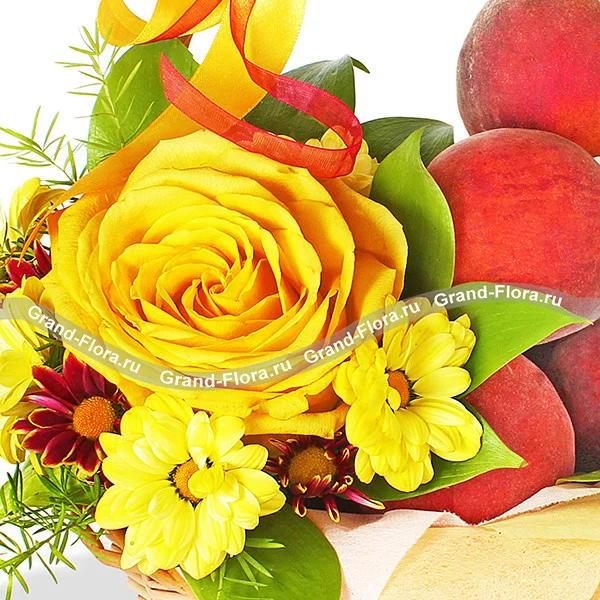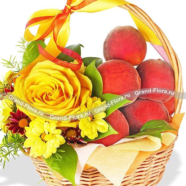 Уменьшенный: роза желтая - 1 шт., хризантема желтая кустовая - 1 шт., рускус - 1 шт., аспарагус - 1 шт., оазис, фетр желтый, бант красно-желтый, корзина малая, персики - 1 кг.