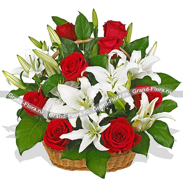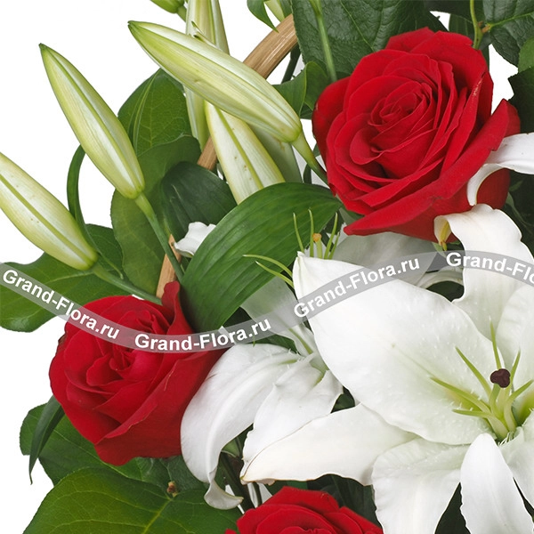Уменьшенный: роза красная (50 см) - 5 шт., лилия белая - 1 шт., рускус, оазис, корзина.