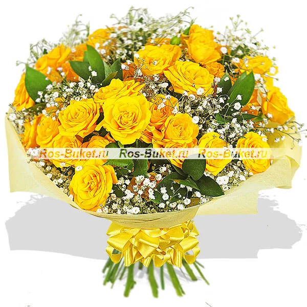 ДЕЛЮКС: роза кустовая желтая - 15 шт, рускус, гипсофила - 7 шт, фетр светло-желтый, бант желтый.