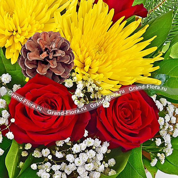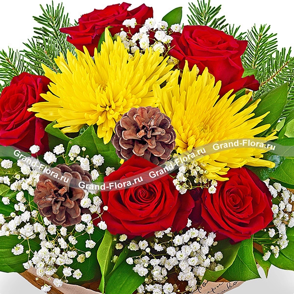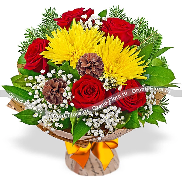 Стандартный: роза красная - 5 шт., хризантема одноголовая желтая - 2 шт., гипсофила - 2 шт., ель , шишки - 2 шт., рускус - 2 шт., упаковка крафт, лента желтая.