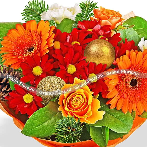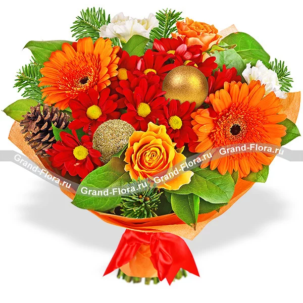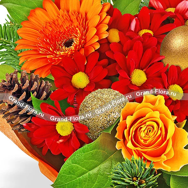 Стандартный: роза жёлтая - 2 шт, гербера оранжевая - 2 шт, хризантема кустовая красная/розовая - 2 шт., гвоздика белая/красная - 2 шт., ёлочные игрушки - 2 шт., шишки - 1 шт, ель, упаковка фетр, лента оранжевая.