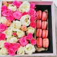 Стандартный: роза кустовая розовая - 5 шт., роза кустовая белая - 2 шт., макаруны (возможна замена на зефир), декор, оазис, коробка средняя.