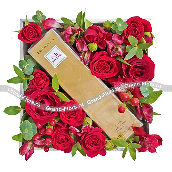 Стандартный: роза красная - 5 шт., роза кустовая красная - 1 шт., альстромерия красная - 1 шт., гиперикум, эвкалипт, декоративная зелень, парфюм Elizabeth Arlen - 30ml., оазис, коробка.