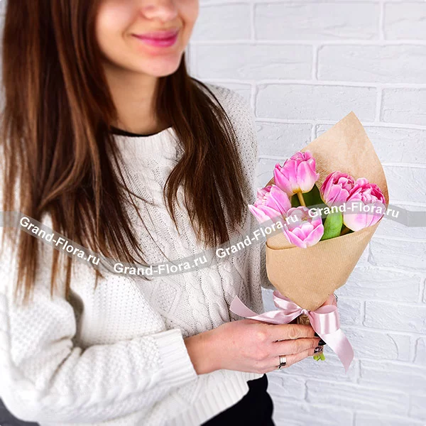 5 тюльпанов: тюльпан розовый - 5 шт., упаковка крафт, лента.