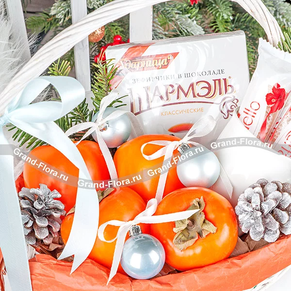 Уменьшенный: хурма - 0,5 кг., зефир "Шармэль" - 75 гр., кружка* - 1 шт., конфеты "Raffaello" 40 гр - 1 шт., шишки - 1 шт., шарики - 1 шт., декор., ель, корзина малая.