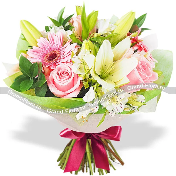 Букет составлен из  розовых роз сорта Ангажемент, нежно – розовых гербер, сливочно – белой альстромерии и нежнейших белых лилий, в окружении салала. Завершает композицию зеленый фетр и лента. Высота букета  40-50 см, а диметр зависит от выбранного варианта букета, которых представлено четыре : уменьшенный, стандарный,люкс и делюкс. В среднем букет в диаметре 25 см. Обращаем Ваше внимание, что состав и упаковка букета могут отличаться.
