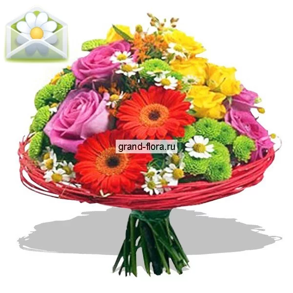 Хризантемы абсентового цвета и нежные белоснежные ромашки окунуть вас в весеннее настроение. Желтые и розовые розы заставят вас вспомнить о лете, а ярко-красные герберы подарят вам улыбку. Если вы хотите поднять настроение дорогим вашему сердцу людям, тогда смело заказывайте эту яркую композицию. Букет роз и гербер в кратчайшие сроки порадует вашего дорогого человека, если вы уже сегодня воспользуетесь услугами нашей международной службой доставки цветов.