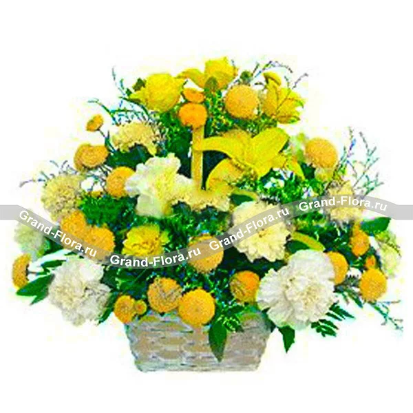 Белоснежные гордые гвоздики, лимонные розы и медовые лилии, окруженные россыпью золотистых хризантем – это удивительное сочетание величия и изысканности. Если вам нравится эта корзина с гвоздиками и хризантемами, тогда вам прийдется по душе и быстрая и надежная доставка нашей международной службы доставки цветов.